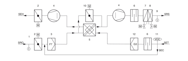 Anschließend durch den Wärmerückgewinner, der in energetisch sinnvollen Betriebssituationen und zum Geräteschutz umgangen werden kann.