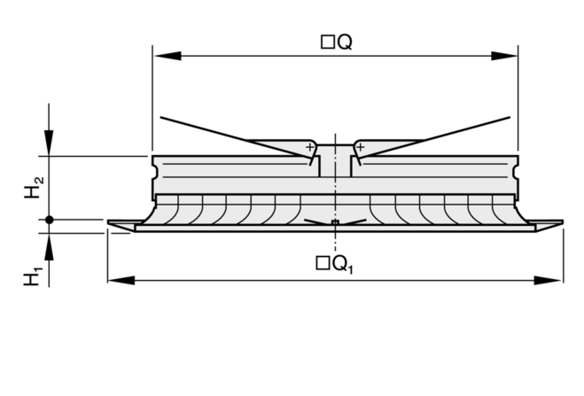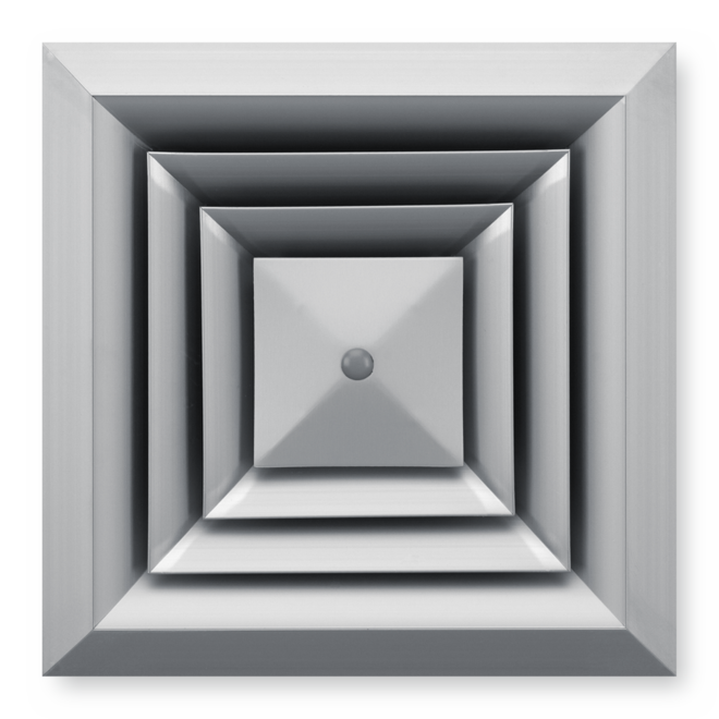 Ceiling diffusers with square diffuser face. Supply air and extract air variants for comfort zones. Diffuser face with fixed air control blades for horizontal four-way air discharge. For installation into all types of suspended ceilings. Ready-to-install component which consists of the aluminium diffuser face with fixed air control blades, a diffuser front frame with perimeter seal and a connecting frame, opposed action blades, butterfly damper or a plenum box. Diffuser face suitable for central screw fixing. Sound power level of the air-regenerated noise measured according to EN ISO 5135.