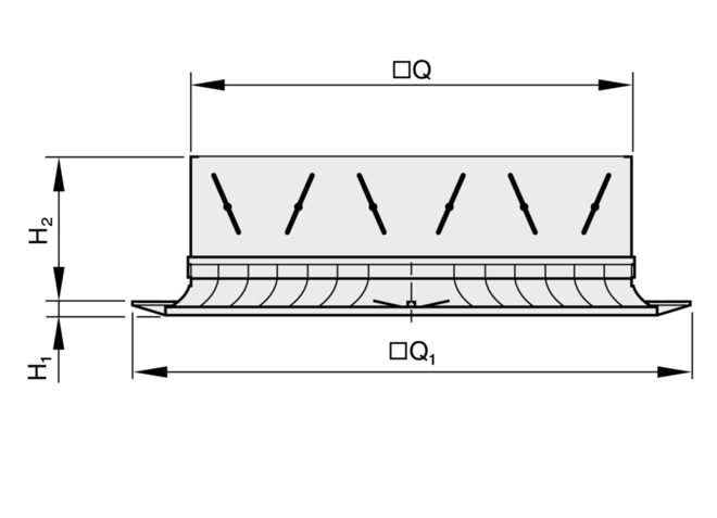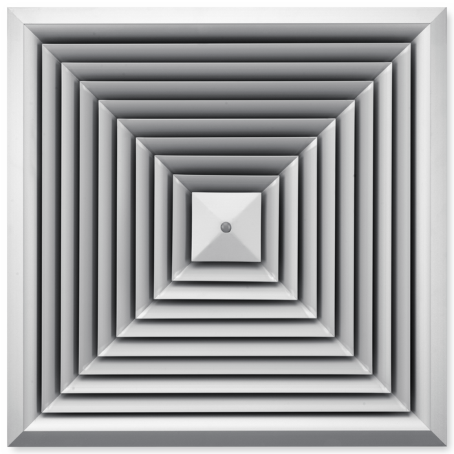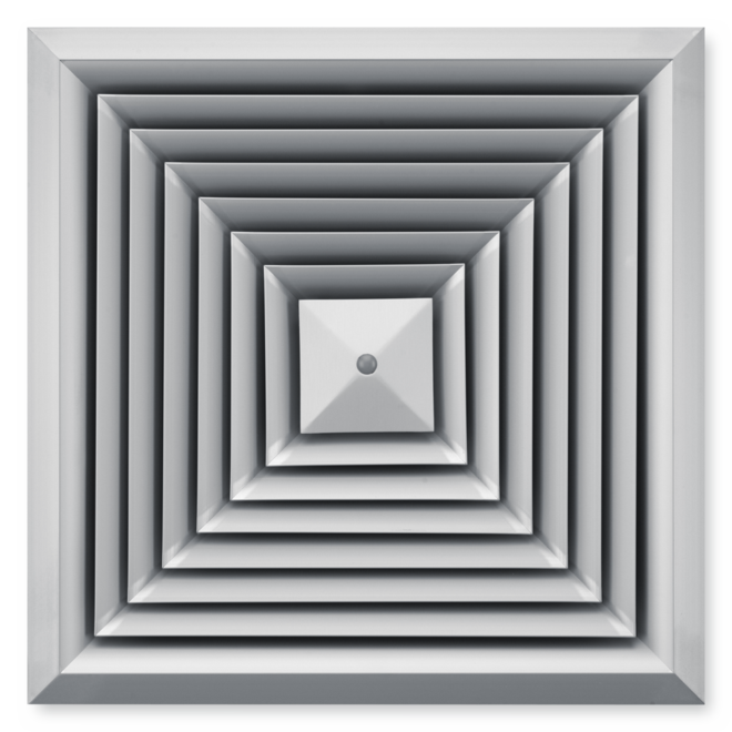 Ceiling diffusers with square diffuser face. Supply air and extract air variants for comfort zones. Diffuser face with fixed air control blades for horizontal four-way air discharge. For installation into all types of suspended ceilings.
