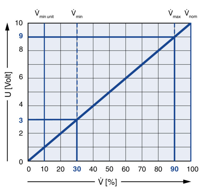 The integral differental pressure transducer transforms the effective pressure into a voltage signal. The volume flow rate actual value is hence available as a voltage signal. The factory setting is such that 10 V DC always corresponds to the nominal volume flow rate (Vnom).