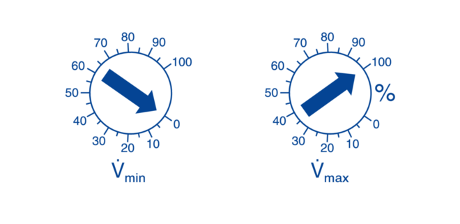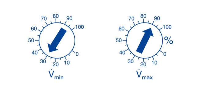 The volume flow rate parameters Vmin and Vmax can be set on potentiometers.