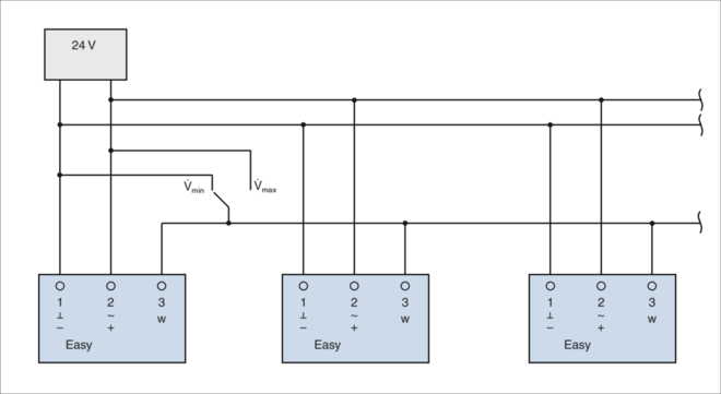 The volume flow rate setpoint value comes from a higher-level controller (e.g. room temperature controller, air quality controller, central BMS) or from switch contacts. Variable volume flow control results in a value between Vmin and Vmax. It is possible to override the room temperature control, e.g. by a complete shut-off of the duct.