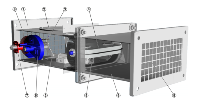 In the event of a fire, the damper is triggered thermoelectrically at 72 °C or 95 °C (use in warm air ventilation systems). As long as power is supplied to the actuator, the damper blade remains open. If the supply voltage fails, the damper closes (power off to close). Motorised fire dampers can be used to shut off ducts. The torque of each actuator is sufficient to open and close the damper blade even while the fan is running.