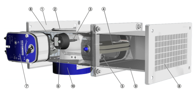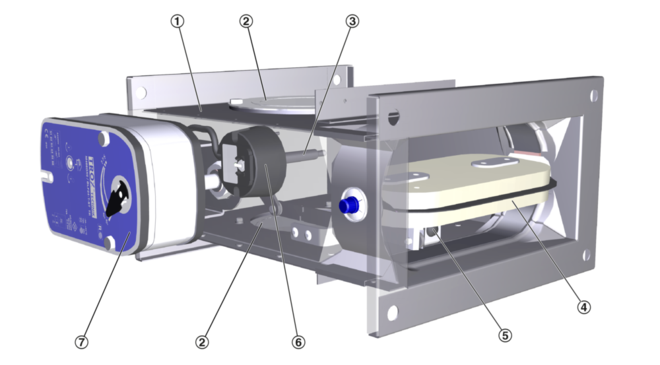 The spring return actuator enables the motorised opening and closing of the damper blade; it can be activated by the central BMS.