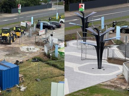 The immediate surroundings are also being further developed: the parking areas have been equipped with photovoltaic modules and charging stations for electric vehicles. The system is ready to feed into the grid and will be connected to it.