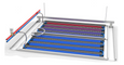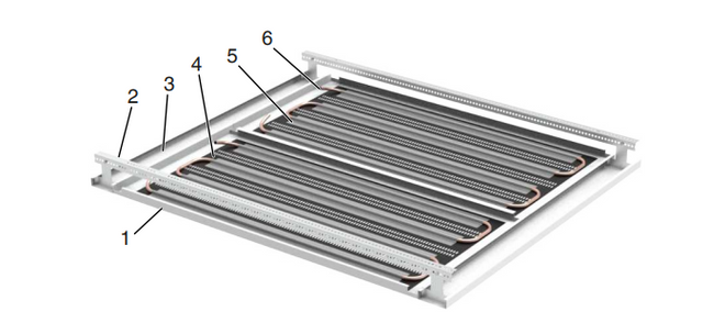 Deckenkühlelemente zur einfachen Kombination mit bauseitigen Metalldeckenplatten in allen marktgängigen Ausführungen. Die Deckenkühlelemente bestehen aus einem Kupferrohrmäander, der mittels speziellen Wärmeleitblechen auf dem Trägerblech verbunden ist. Um die höchste Qualität bei der Wärmeleitung zu erreichen, erfolgt diese Verbindung mittels einer patentierten WLT®Technik. Das Trägerblech ist mit einem Hochleistungsklebeband zur einfachen und werkzeuglosen Verbindung mit der bauseitigen Deckenplatte ausgestattet. Durch die vollflächige Verklebung wird ein optimaler Wärmeübergang über die Kontaktfläche dauerhaft gesichert. Die Trägerbleche sind den vorgesehenen Deckenplattenabmessungen angepasst. Optimierte Kühlleistungen durch Anpassung der Mäanderanzahl und Mäanderteilung möglich. Die Mäander werden, in Abhängigkeit von den bauseitigen Metalldeckenplatten, in verschiedenen Anschlussvarianten ausgeführt. Die Rohrenden der Deckenkühlelemente sind zur Kühlelementinnenseite gebogen, um geringe Einbauhöhen zu realisieren. Verbindungen untereinander und zu den Hauptverrohrungsleitungen erfolgen vorzugsweise mit flexiblen Schläuchen. In Abhängigkeit von den maximal gewünschten Druckverlusten und dem Deckenaufbau können mehrere Deckenkühlelemente zu einem Kühlkreis zusammengeschaltet werden.