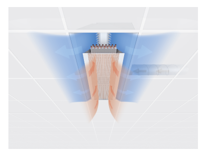 DID Deckeninduktionsdurchlässe bringen zusätzlich zur Wasserkühlung oder -erwärmung Frischluft aus der RLT-Anlage in den Raum ein. Da das System nach dem Prinzip der Induktion arbeitet, kann im Vergleich zu Nur-Luft-Systemen der Volumenstrom erheblich reduziert werden, um die gleiche thermische Leistung zu erreichen. Zusätzliche Ventilatoren zum Transport der Sekundärluft sind überflüssig, deshalb arbeitet das System geräuscharm und spart Energie.