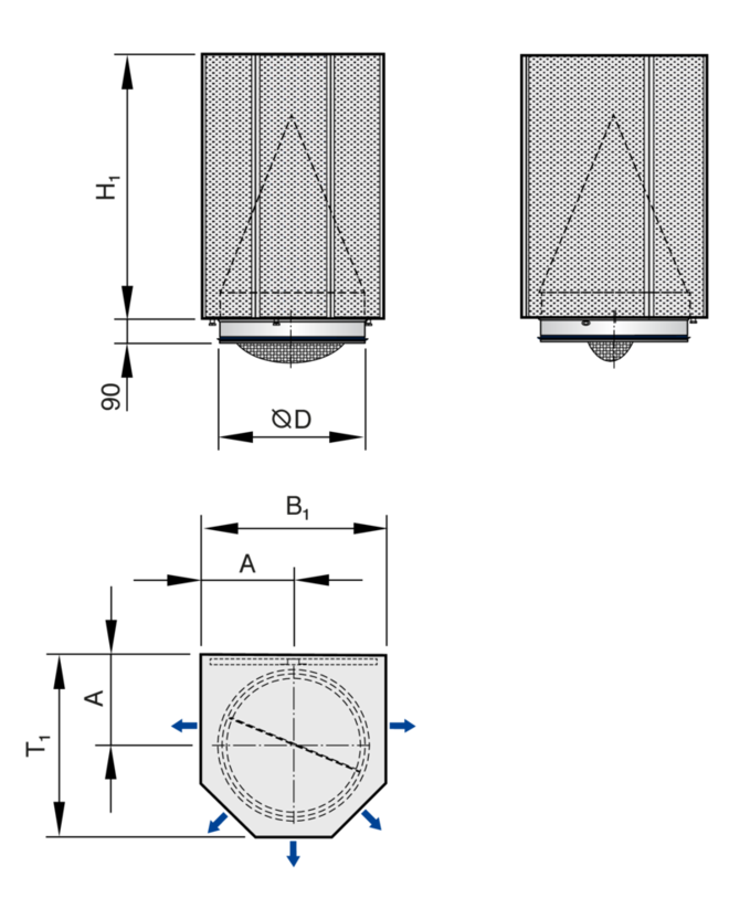 Mit dreiseitiger (90°) oder fünfseitiger (180°) Ausströmung für turbulenzarme Quelllüftung. Gehäuse mit vieleckigem Querschnitt zum Wandvorbau.