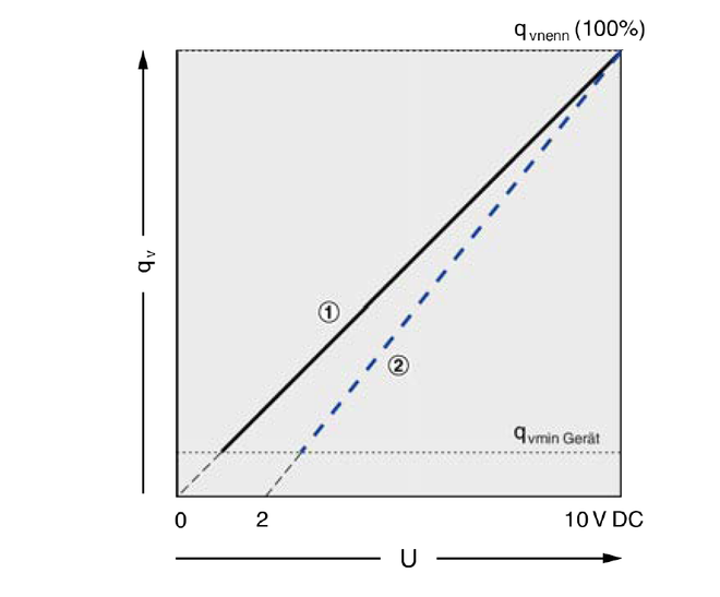 Die Analogschnittstelle kann für den Signalspannungsbereich 0 – 10 V DC oder 2 – 10 V DC eingestellt werden. Die Zuordnung von Volumenstromsollwert bzw. istwert zu Spannungssignalen ist in den Kennliniendarstellungen abgebildet.