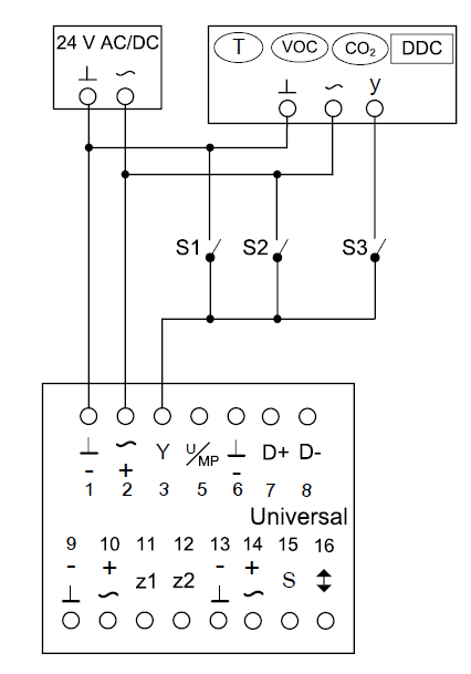 Der Volumenstromsollwert wird von einem übergeordneten Regler (z. B. Raumtemperaturregler, Luftqualitätsregler, Gebäudeleittechnik) vorgegeben. Die variable Volumenstromregelung erfolgt zwischen qvmin und qvmax. Die Übersteuerung der Raumtemperaturregelung durch Zwangssteuerung, beispielsweise Absperrung, ist möglich.