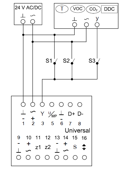 Durch passende Beschaltung der Eingänge Y, Z1, Z2 können die Zwangssteuerungen entsprechend den Anschlussbildern über Beschaltung mit externen Schaltkontakten/Relais aktiviert werden (siehe Verdrahtungsbeispiele).