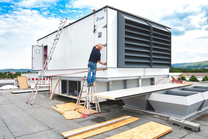 Dach- und Fassadenumbau kann beginnen. Die bisherigen Jalousieklappen in der Fassade des Gebäudes müssen entfernt und die Öffnungen geschlossen werden. Dann gilt es das Dach zu öffnen und Wärmerückgewinnung und RLT-Zentrale miteinander zu verbinden.
